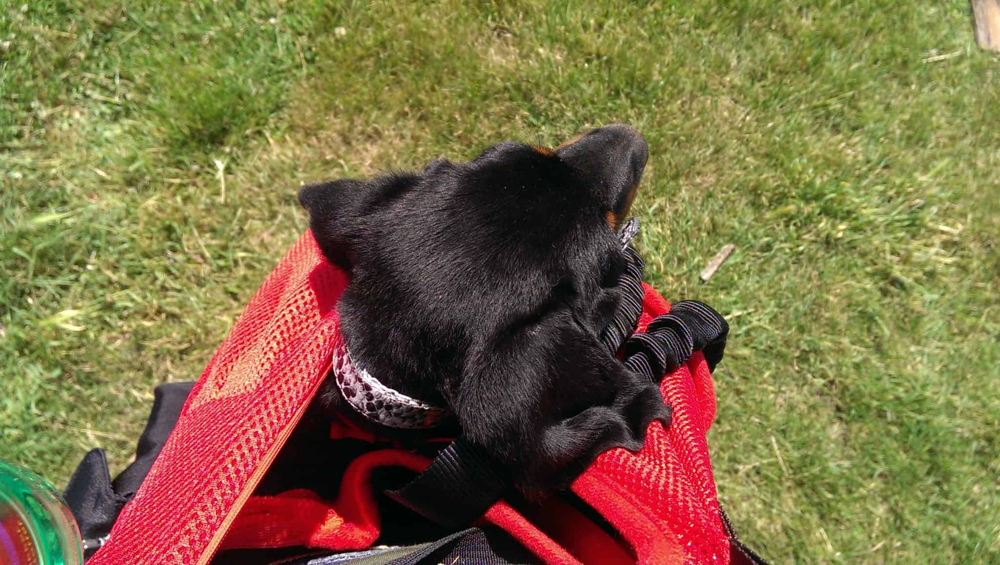 That sling experience made the next day’s ride in the airport carrier a lot more acceptable. She hated, hated being crated, but if I opened the top of the carrier so it felt like the sling instead of a crate, she was fine with it. Even when she slept, she wanted her head out; if she slipped back inside, she’d immediately wake and prop her head up again. That open top and the day of sling-carrying saved a lot of screaming on the plane.